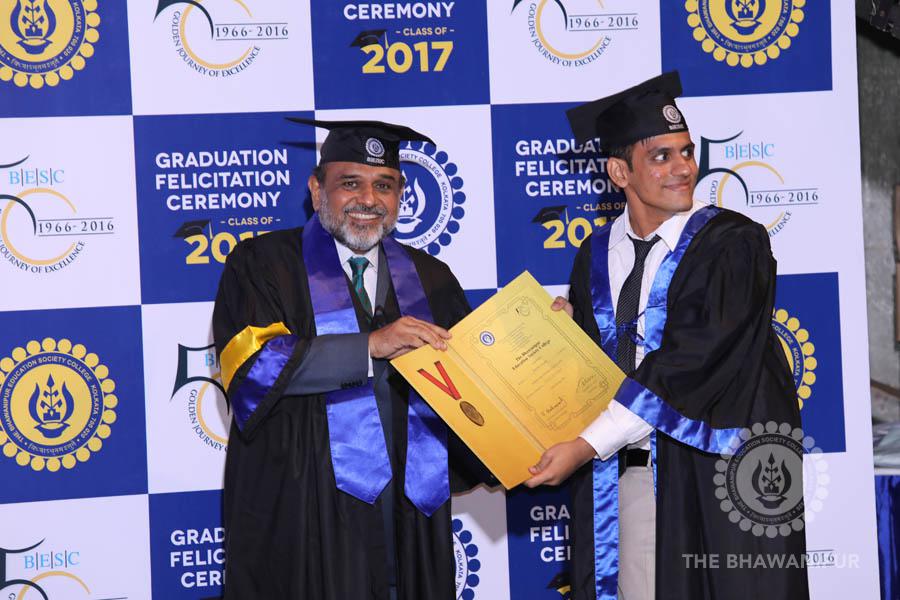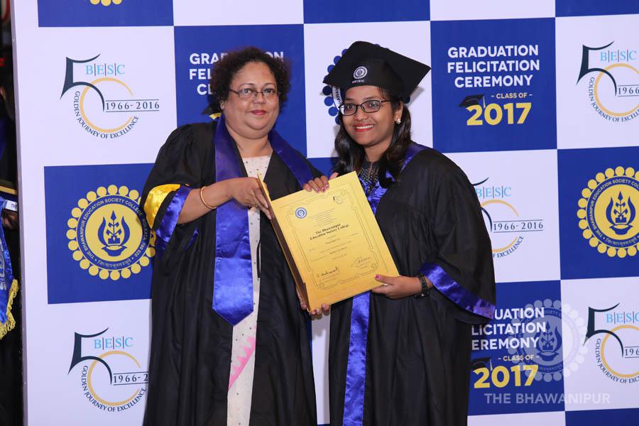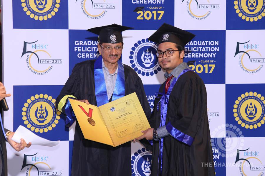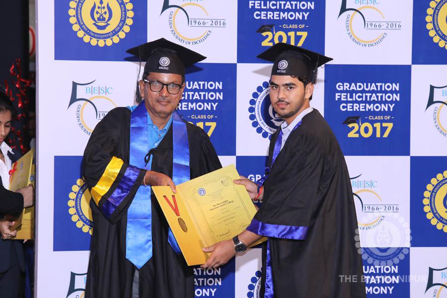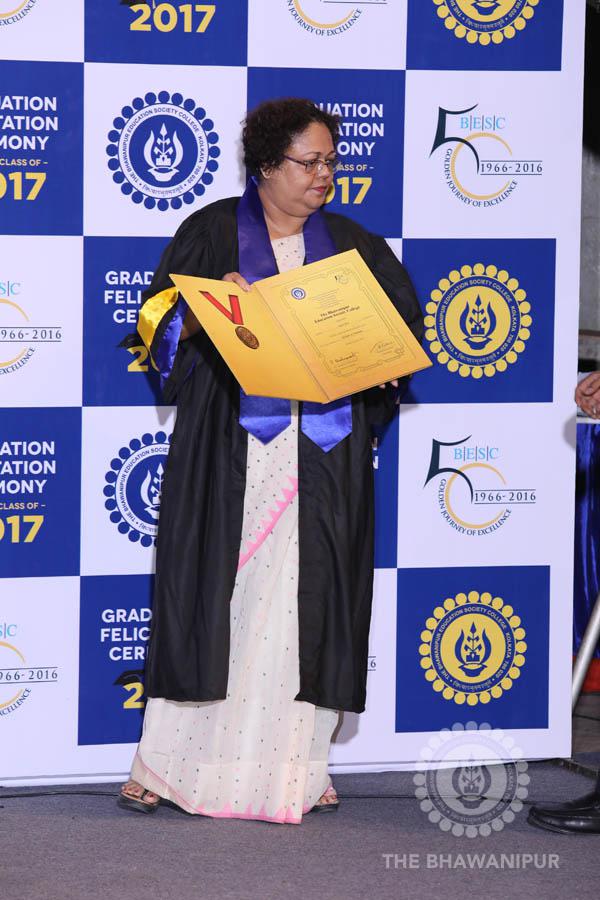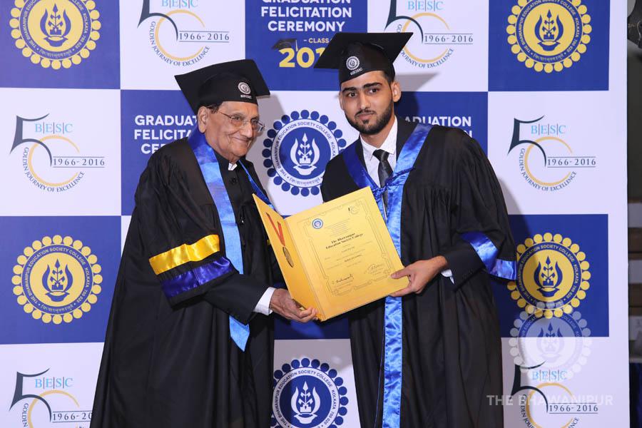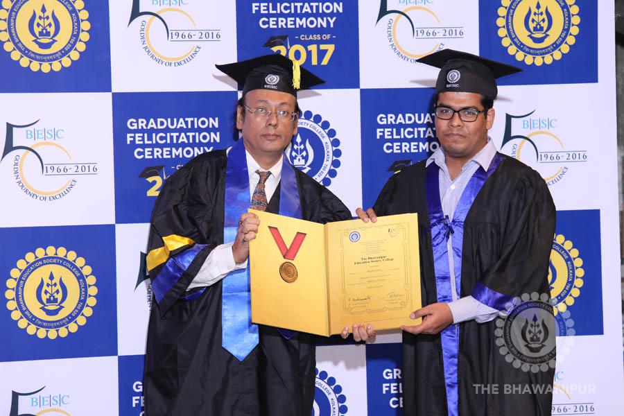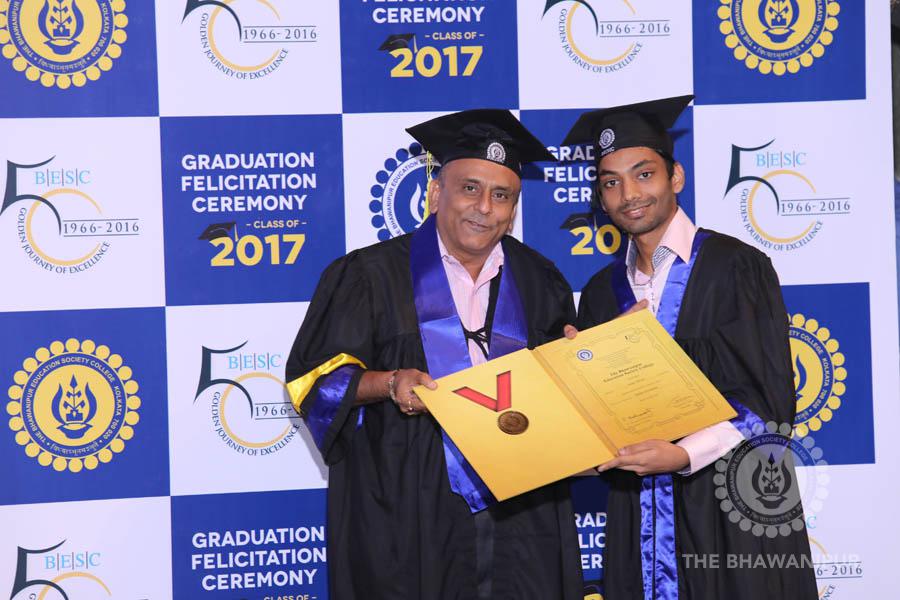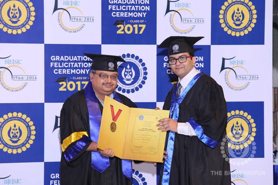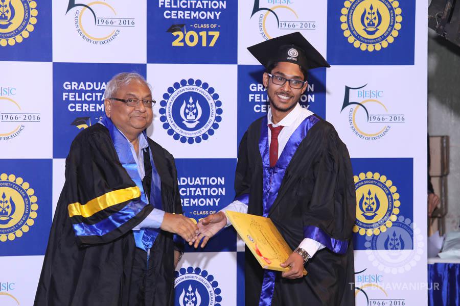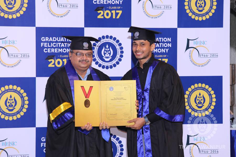 Gurudev Rabindra Nath Tagore’s immortal lines “Where the Mind is without Fear” played in the background as the Convocation procession – comprising of the Chairman of the Bhawanipur Education Society College, Champak Bhai Doshi; the Chief Guest Chetan Bhagat; the Vice Chairman Miraj D Shah; the Director General Prof Suman K Mukherjee; the Dean of Student Affairs Prof Dilip Shah; the Rector; the Teacher in Charge and senior members of the faculty moved on stage in full ceremonial regalia. The Guests were welcomed and the Ceremonial Lamp of Knowledge ignited to formally begin the proceedings of the solemn occasion – the Convocation of the Class of 2017.
