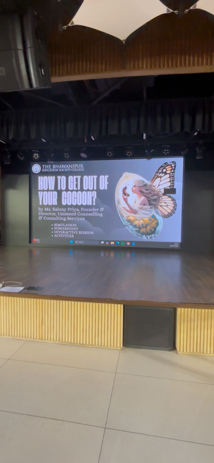 The seminar titled “How To Get Out Of Your Cocoon” was conducted on 26th August 2025, at the Concept Hall of the Bhawanipur Education Society College, by Ms. Salony Priya, a distinguished counselling psychologist and the Founder-Director of Ummeed Counselling and Consulting Services. The event lasted for two hours, starting at 11:00 A.M. and continuing until 1:00 P.M. It was graced by the Rector and Dean of Student Affairs, Prof. Dilip Shah, who inaugurated the session with inspiring words and felicitated Ms. Salony Priya. The seminar aimed to help students transcend self-imposed limitations, recognise the significance of mental health, and foster interpersonal growth alongside academic pursuits.