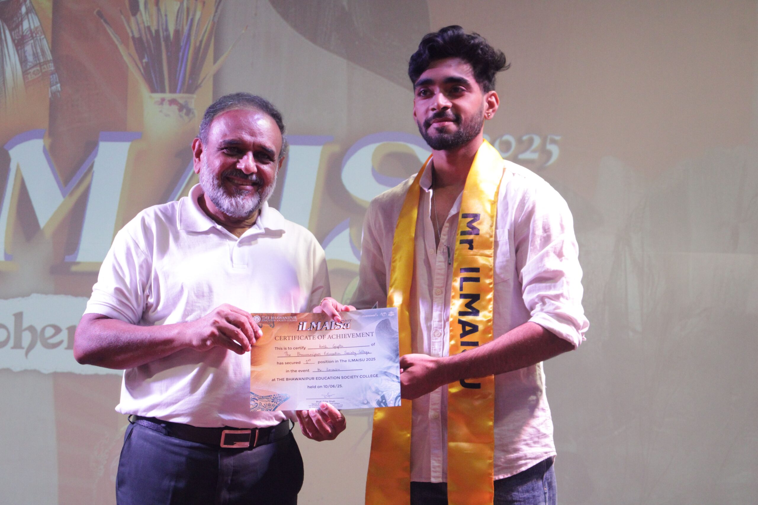 CLOSING CEREMONY: Starting at 4:00 P.M., Prof. Dilip Shah and Prof. Minakshi Chaturvedi handed out trophies, medals, and certificates. Krish Gupta (BESC) and Julia Emanuel (BESC OTSE) were crowned Mr. and Miss Ilmaisu respectively. Jaipuria College won first place in Short Film Making, followed by Asutosh College. THK Jain College won Best Director, while Rupantar Majumder (Heritage College) and Mayurakhi Basak (Asutosh College) won Best Actor and Actress respectively. Sister Nivedita University won Doodling, with Techno India University second. In Creative Makeover, Techno India University won first, and THK Jain College was second. Loreto College and Banaras Hindu University took first and second in Calligraphy. BESC OTSE won the Reel Making event, followed by Jaipuria College. Techno India University won Face Painting, followed by Sister Nivedita University. In Fashion Show, Sister Nivedita University won, with BESC second. Krish Gupta and Jaishika Kaur (both BESC) were awarded Best Male and Best Female respectively. Techno India University won Overall Champions, and Sister Nivedita University were Runners-Up. The ceremony ended at 5:00 P.M.
