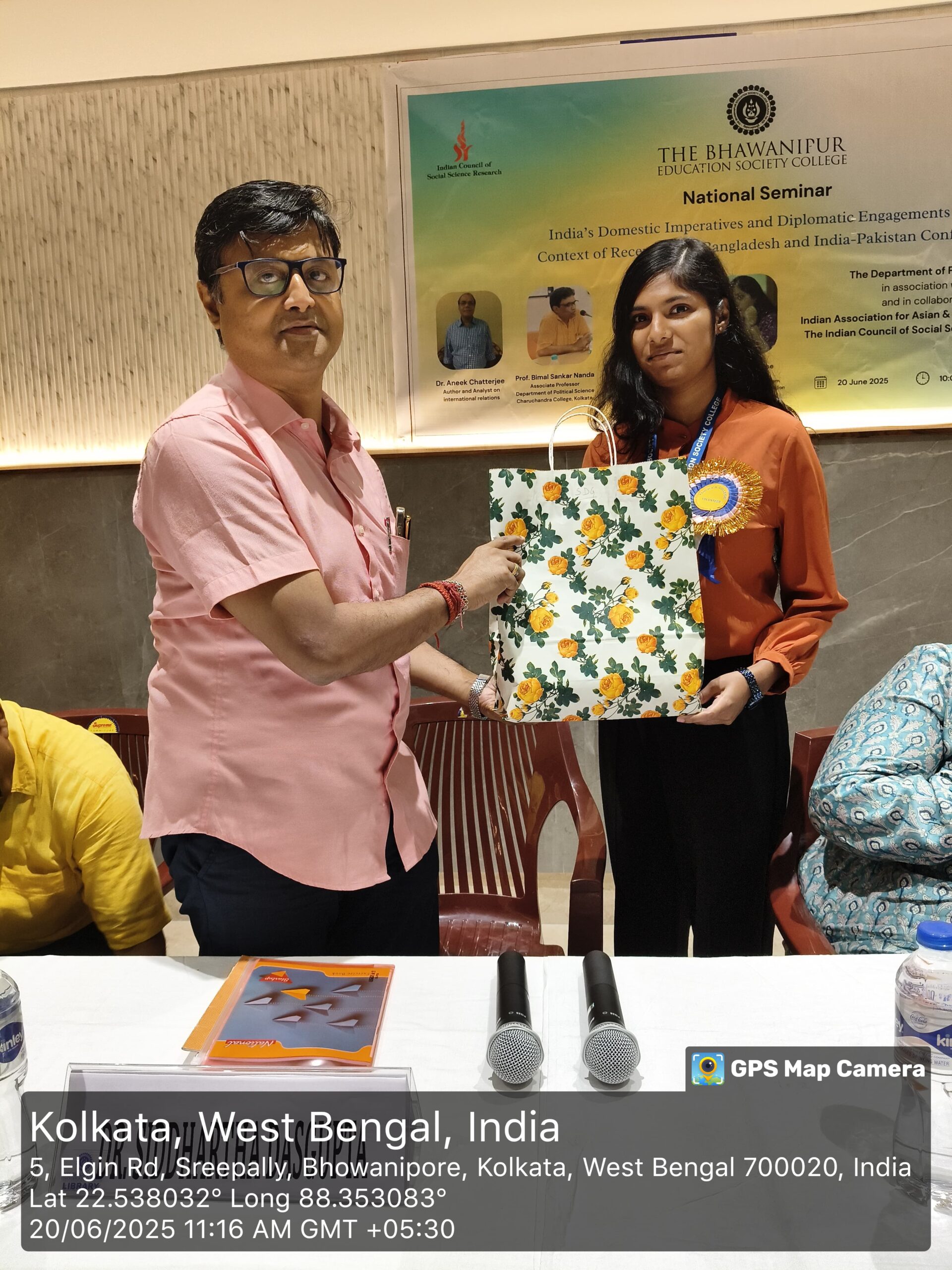 Name of the Activity: National Seminar on India’s Domestic Imperatives and Diplomatic Engagements in Context of the Recent India-Bangladesh and India-Pakistan Relations Organising Department: Political Science in collaboration with Indian Association for Asian and Pacific Studies (IAAPS) and Indian Council of Social Science Research (ICSSR) Type of Activity: Academic Seminar Date/ Duration of Activity (from-to): 20th June, 2025 Time: 10:00 am – 2:00 pm Details of Resource persons (Name, Designation, Affiliation, Area of Specialisation, etc): Aneek Chatterjee, Author and Analyst of International Relations