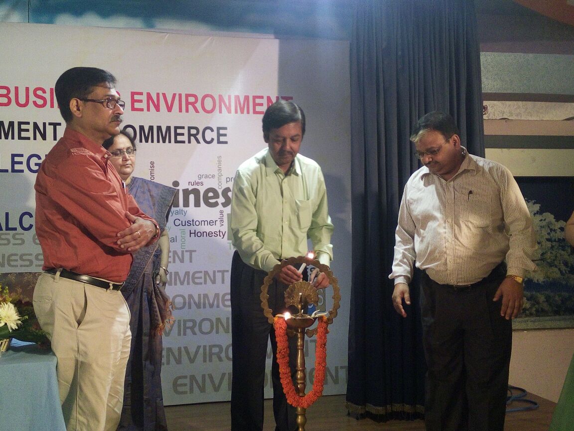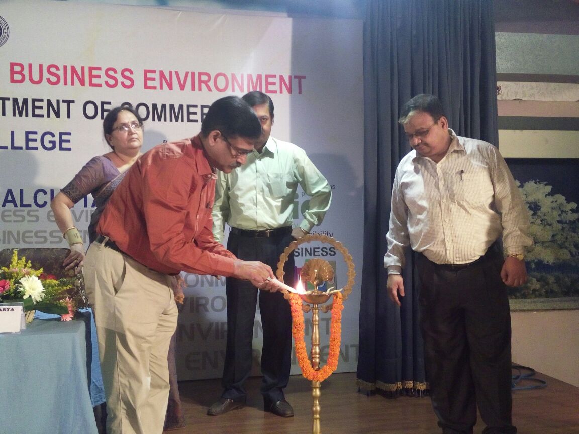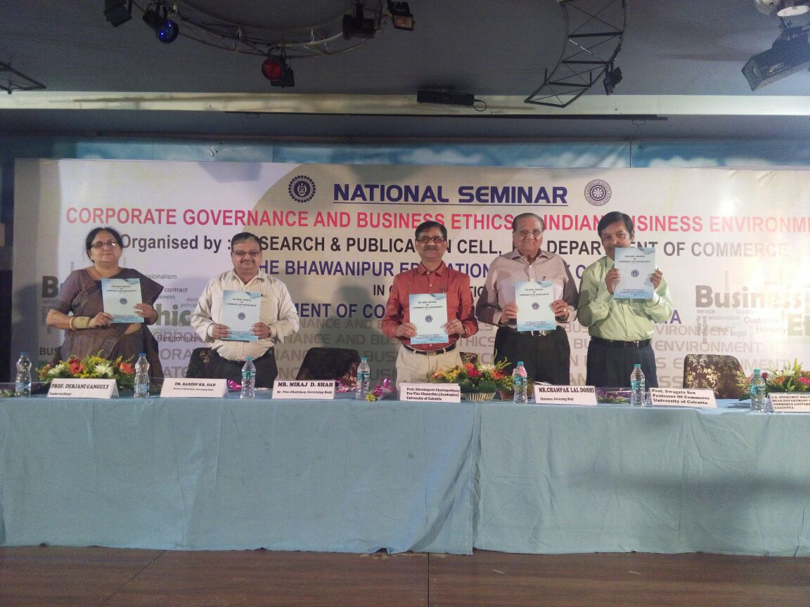 On Tuesday, 28th April, 2015, NATIONAL SEMINAR on “CORPORATE GOVERNANCE AND BUSINESS ETHICS IN INDIAN BUSINESS ENVIRONMENT” was held, venue being the 6th Floor college auditorium. The seminar was organised by Research & Publication Cell, Post Graduate Department of Commerce in collaboration with Department of Commerce, University of Calcutta. The 10 a.m. to 5 p.m. programme started with a one-minute mourn for the Nepal earthquake victims which occurred on 25th April, 2015. The inauguration ceremony started with an address by Prof. Lalit Kumar Joshi, organising secretary, where he presented the theme of the seminar. This was followed by the welcome address by Prof. Debjani Ganguly, Teacher-in-Charge addressing Prof. Dhrubajyoti Chattopadhyay, Pro-Vice Chancellor (Academics), University of Calcutta, Prof .Swagata Sen, Dean, Faculty Council for Post Graduate Studies in Commerce, Social Welfare and Business Management, University of Calcutta, Prof. Ranjan Kumar. Bal, Professor and Former Dean of Commerce, Utkal University, Bhubaneswar and Former President, Indian Accounting Association. The first journal by research and publication cell named “The BESC journal of Commerce and Management” was realised by Prof. Dhrubajyoti Chattopadhyay Pro-Vice Chancellor (Academics). The lamp lighting ceremony was then carried out by Prof. Dhrubajyoti Chattopadhyay. The seminar was also graced by a galaxy of intellectuals from different areas of the country i.e. both from inside the state and outside. In his inaugural speech Prof. Dhrubajyoti Chattopadhyay spoke on various points and sub points of following Corporate Governance and the importance and ways of following Business Ethics for a successful economy.