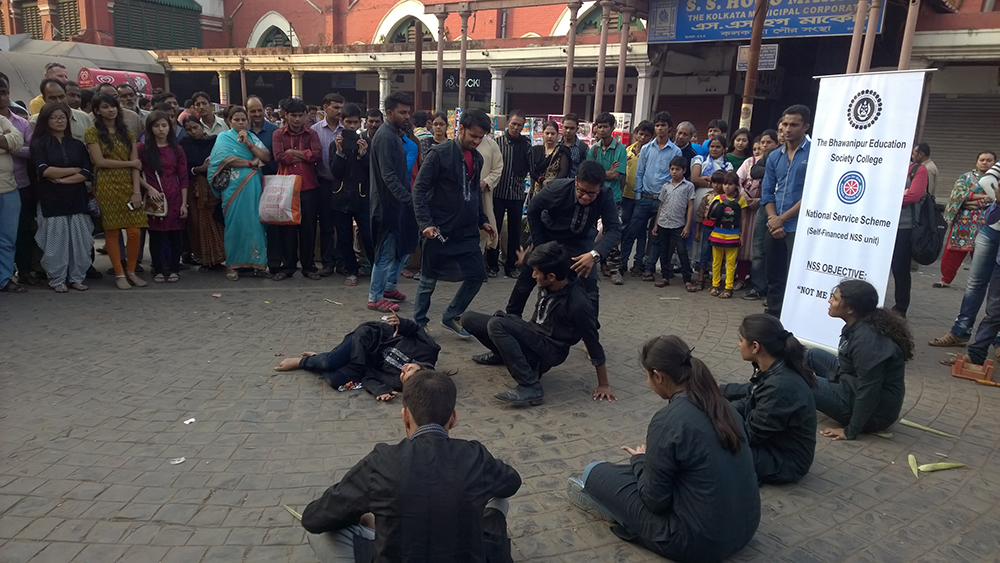 The Bhawanipur Education Society College organised a Street Play at New Market Sim Park Mall on 26th January, 2015 accompanied by Prof. Dilip Shah and Prof. Soumendra Laha. There were a total of three plays by The Bhawanipur Education Society College and Shastri College. The theme of the B.E.S.C’s street play vividly focused on issues like inhuman terrorist activities and peace disruption on religion ground in our society. Shivnath Shastri College presented a play on Women Empowerment.