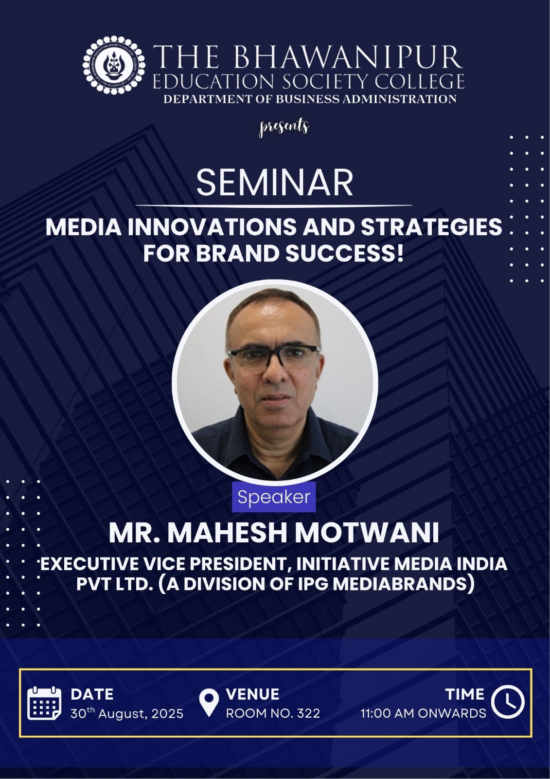 The Department of Business Administration at The Bhawanipur Education Society College successfully organized a seminar titled ” Media Innovations and Strategies for Brand Success!” on 30th August at 11AM. The event was held in Room 322 (3rd Floor) and attracted an enthusiastic audience, with over 50 students in attendance from all semesters.