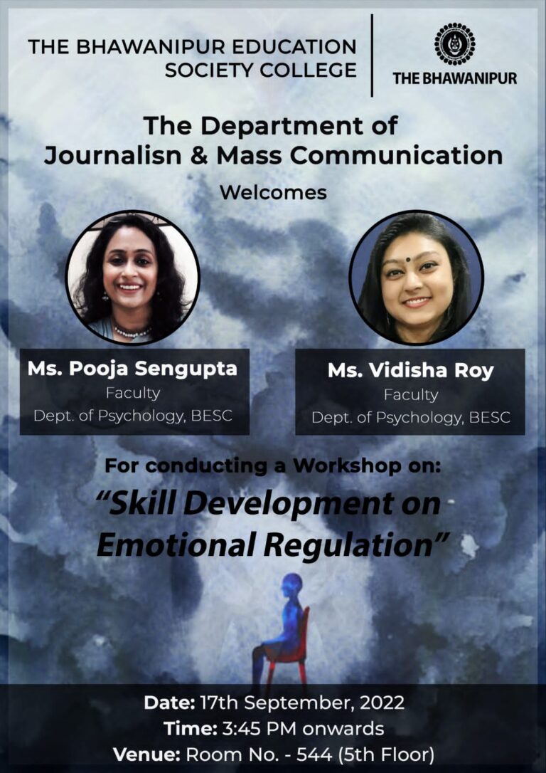 Emotional regulation is an awareness and understanding of one’s emotions and their impact on behavior, and the ability to manage those emotions in a positive way. The Department of Journalism and Mass Communication of The Bhawanipur Education Society College conducted a workshop on skill development on emotional regulation on 17th September 2022 for the departmental students. The session was conducted by Ms. Pooja Sengupta and Ms. Vidisha Roy, faculty members of the Department of Psychology of the college. The workshop started with a welcome speech by a student of the department, Archisha Ghosh. There were many topics that were highlighted and touched upon during the session. It includes the definition of the word ‘emotion’, and the difference between feeling, emotion, and mood. Basic emotions (happiness, sadness, anger, and fear) and their characters were explained. The key component the workshop highlighted and critically focused on was ‘anger management.’ The expression of anger during certain situations and its effect along with the strategies to cope with emotional outbursts. The students were told about the different methods and techniques they can use like deep breathing or going for a walk, etc. The importance and need to be emphatic towards others in today’s world was also explained. The sharing of personal experiences made the session more interactive and fun to learn. The workshop ended with a vote of thanks by Ms. Shaswati Das; who thanked the lecturers for such a wonderful experience and with the hope of having many more such sessions in the future.