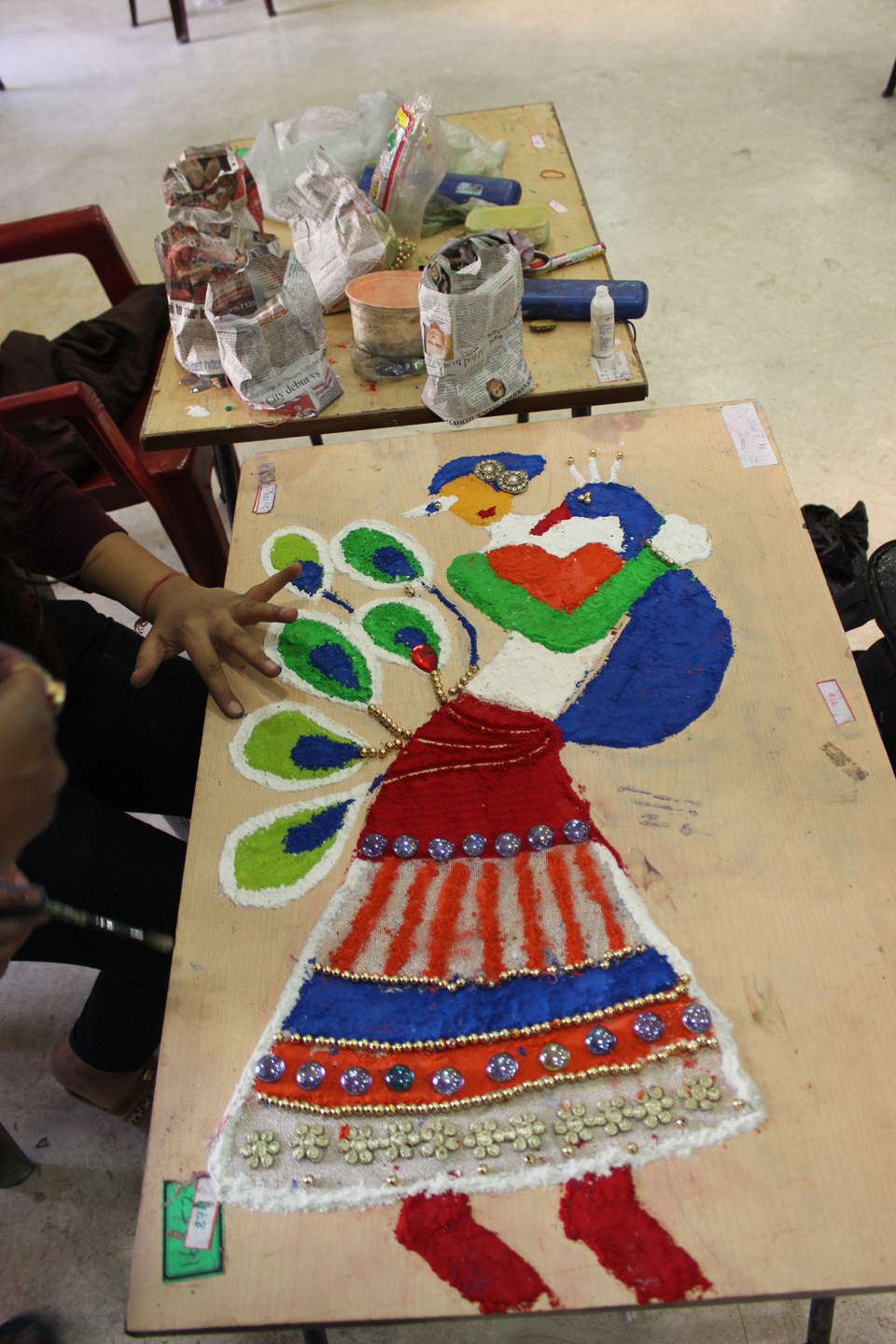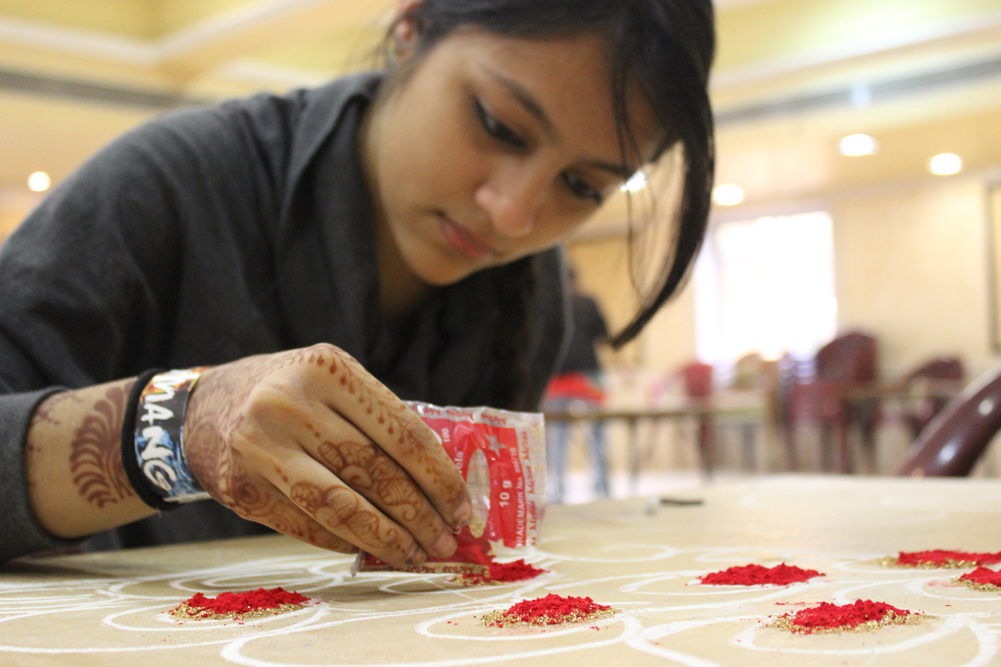 Rangoli, also known as Kolam or Muggu, is a folk art from India in which patterns are created on the floor in living rooms or courtyards using materials such as colored rice, dry flour, colored sand or flower petals . The Rangoli competition was held on the Valia Hall.
