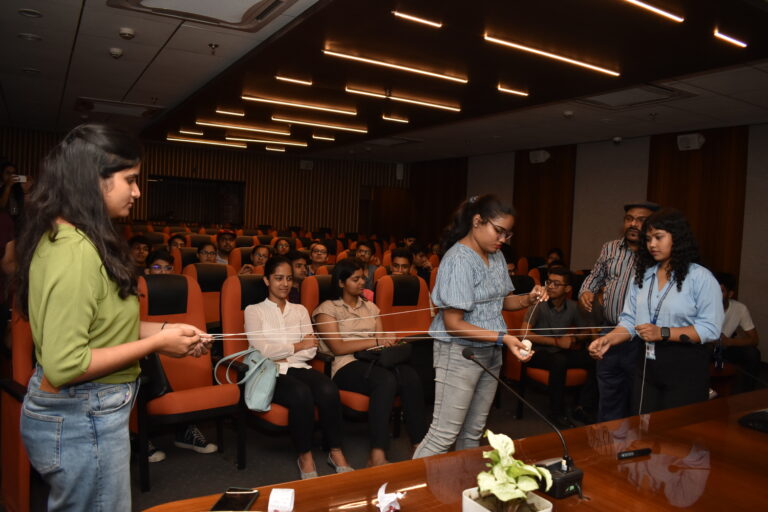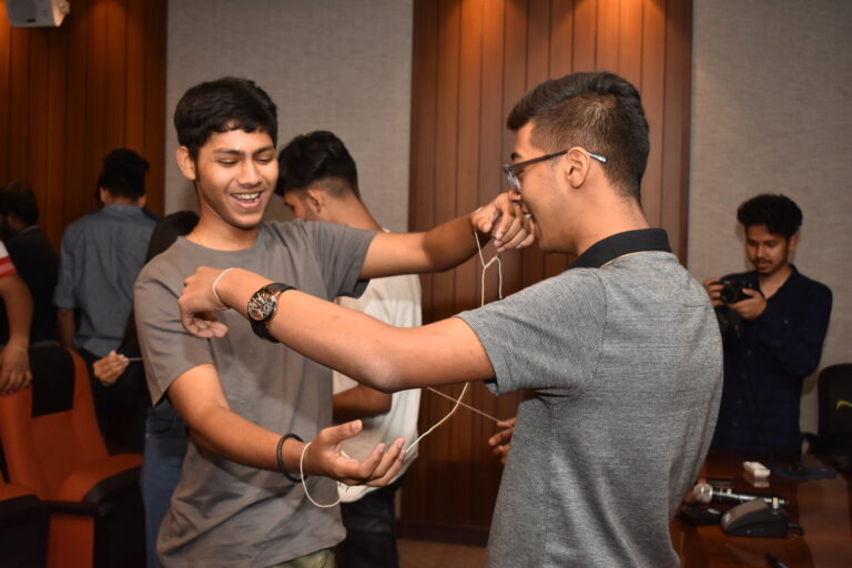 Dr. Bhattacharya began the workshop with an interesting activity where he distributed Threads of equal lengths among the students and asked them to tie them around their hands, find a partner and tangle their threads in a way that seemed impossible to get out of it. Then he asked the students to find a solution to this problem by freeing themselves. Through this activity, Dr. Bhattacharya taught the students that there is always a way to solve a problem if we think creatively.